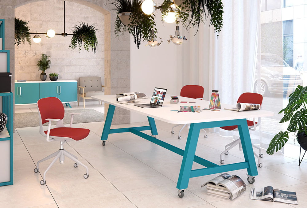 In a workplace setting, collaborators must be able to communicate clearly and share knowledge effectively. Work tables are a great piece of collaborative office furniture for this. Work tables are a hybrid between meeting tables and bench desks. Usually they include cable management systems in the centre and are ideal for collaborative working.