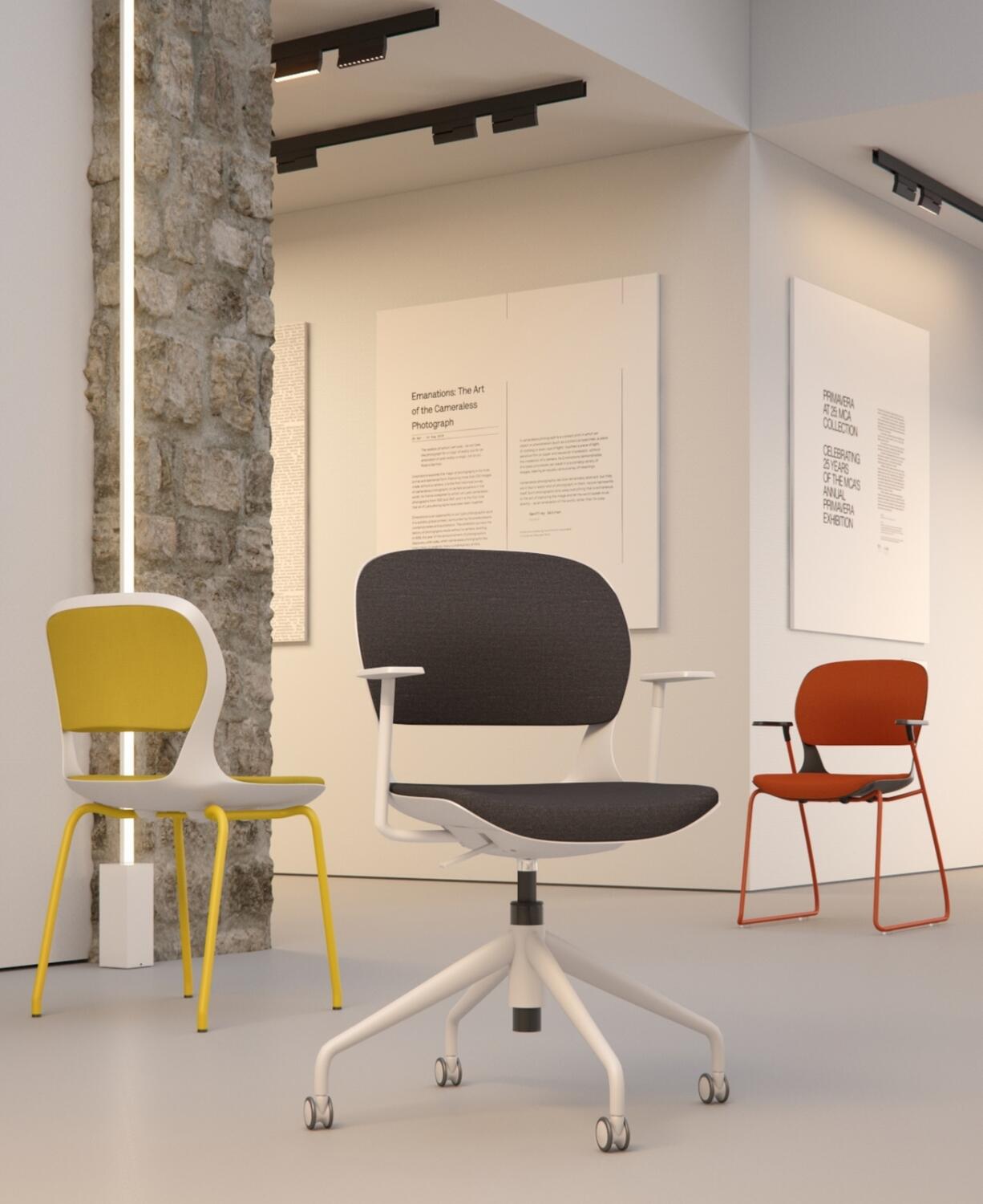 Ace Chair Inspired by a graceful design that follows an endless loop, creating a unique visual alliance between the upholstered seat pad and single-shell frame. The open lumbar area and flexible back supports users, providing relaxed comfort when seated.